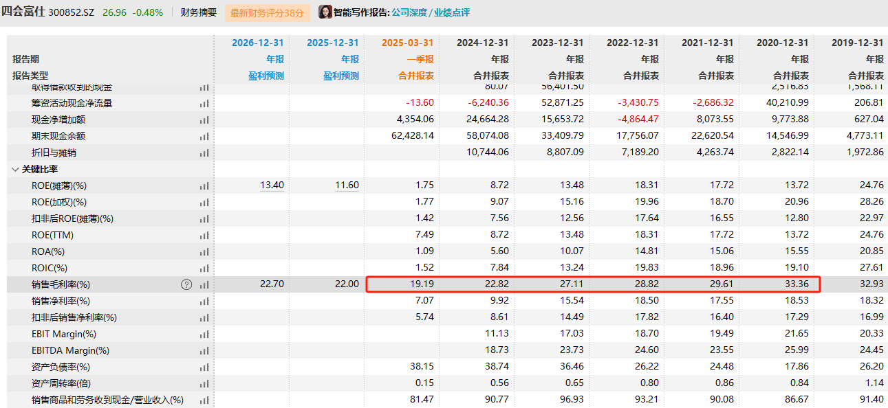 今年一季报数据显示,四会富仕一季度销售毛利率为19.19%。Wind数据显示上海股指期货配资,2020年至2024年,公司的销售毛利率分别为33.36%、29.62%、28.82%、27.12%、22.82%。不难看出,过去5年,四会富仕的销售毛利率持续下滑,较最高点已下滑超10个百分点。